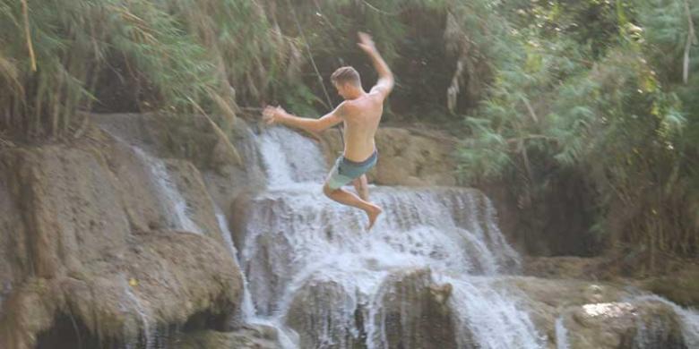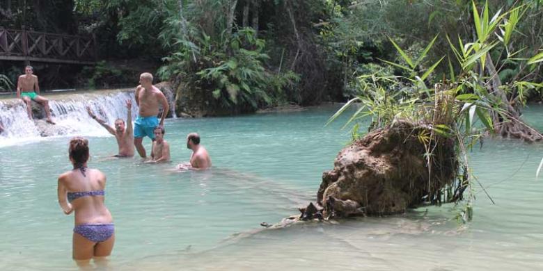 Aksi turis di air terjun Kuang Si di Luang Prabang, Laos.Jangan khawatir, pengelola kawasan menyediakan ruangan ganti pakaian bagi turis yang ingin berenang dan membersihkan diri. Bila tidak ingin berenang, turis bisa hanya sekadar duduk–duduk di pinggir aliran air sambil menikmati pemandangan.
